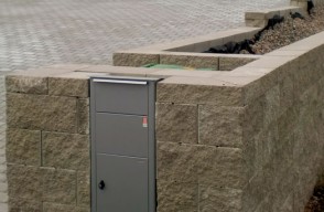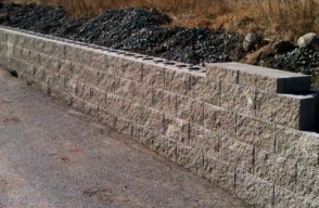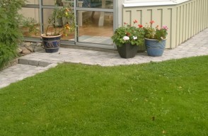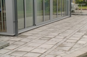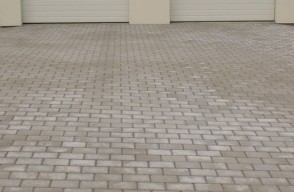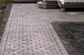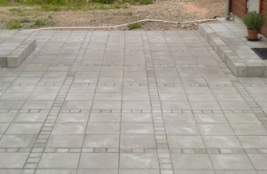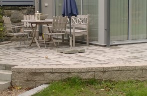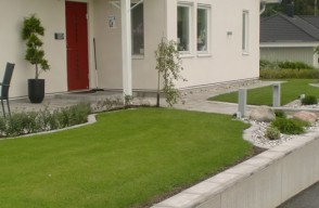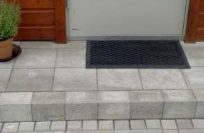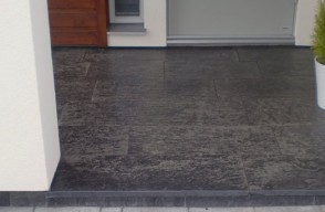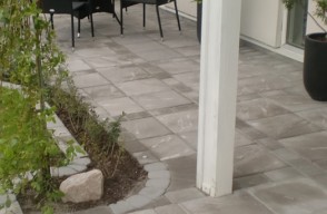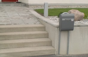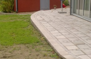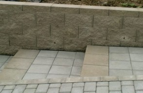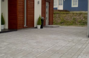 Uppfart, trappa, mur och yta mellan hus/garage.
